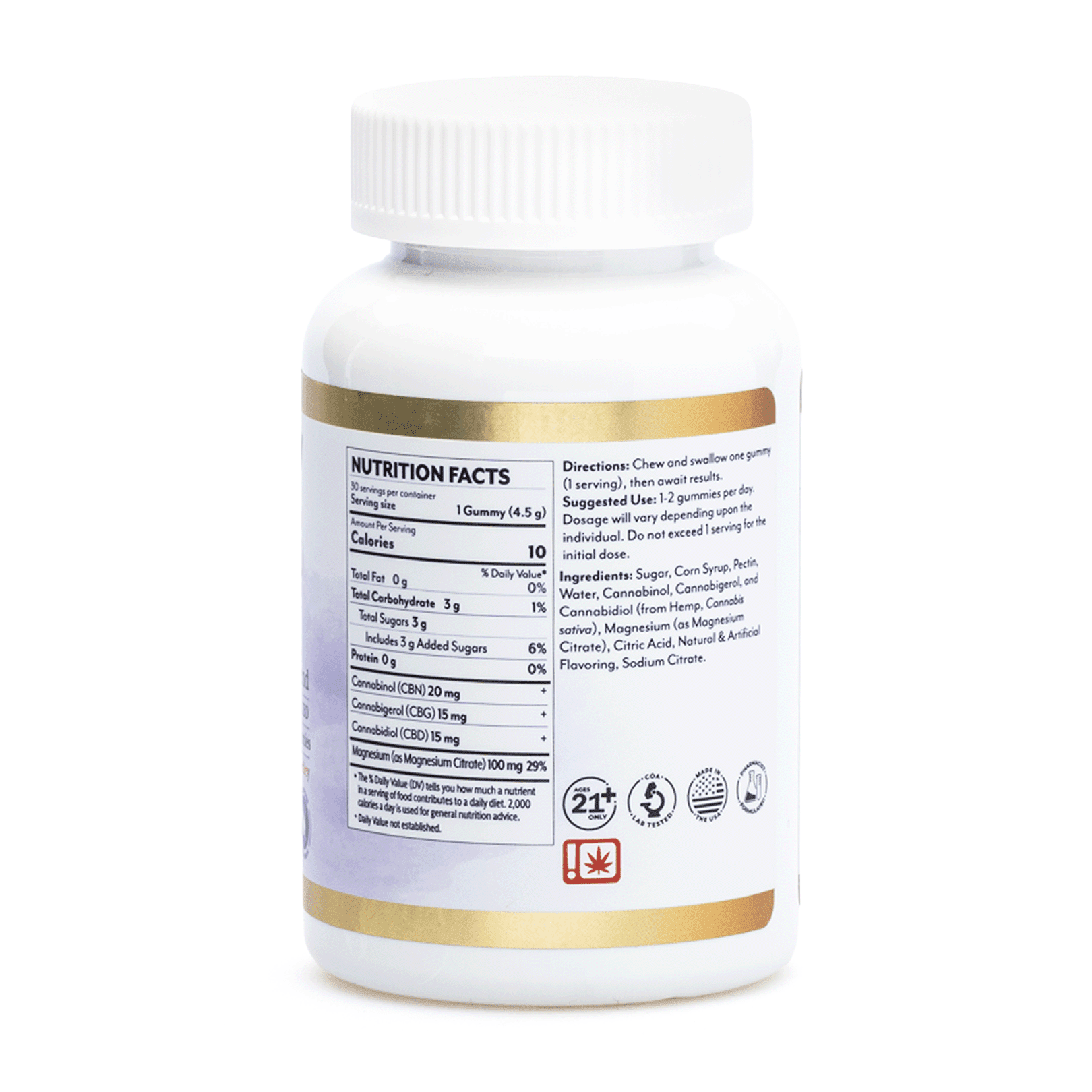 Sugar, Corn Syrup, Pectin, Water, Cannabinol, Cannabigerol, and Cannabidiol (from Hemp, Cannabis sativa), Magnesium (as Magnesium Citrate), Citric Acid, Natural and Artificial Flavoring, Sodium Citrate.